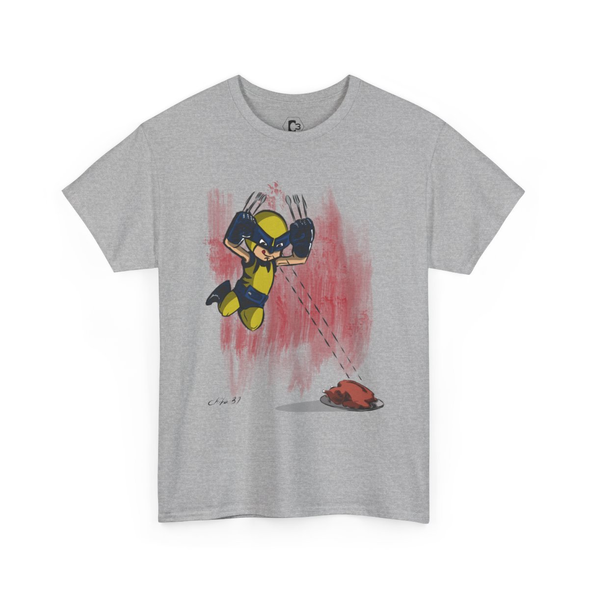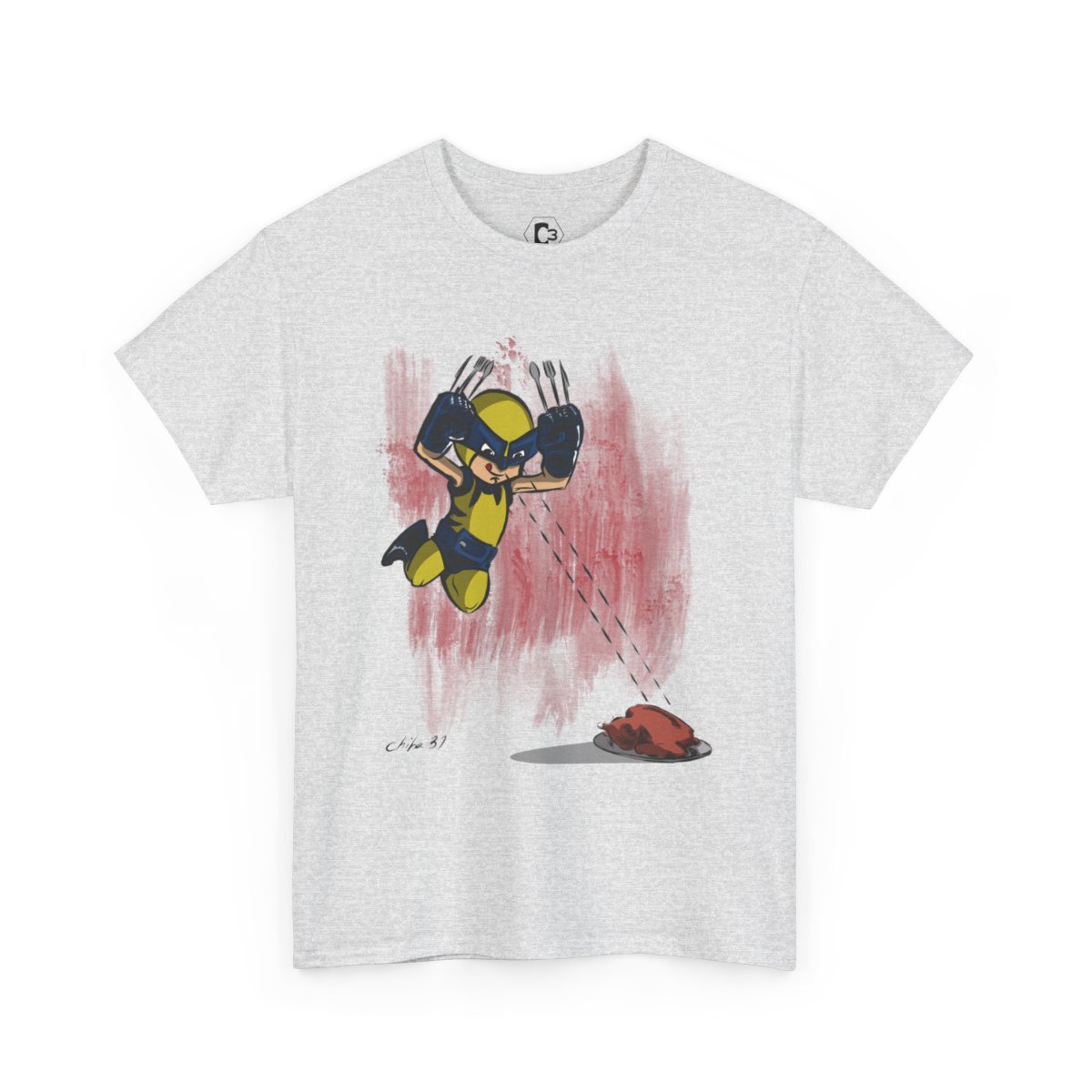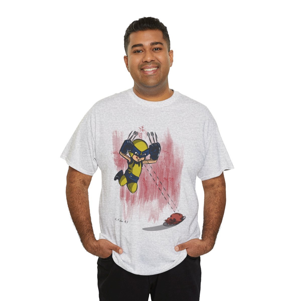 Designed in a dynamic animation style by Chiba, this shirt brings the adventurous and playful essence of superheroes to life, with bold, vibrant colors and a humorous twist. The graphic portrays Wolfe Junior in all his glory, with a big bite of food in hand, as if to say, "Even heroes have to eat!" Whether you're grabbing a quick snack or enjoying a feast, this T-shirt makes a statement about how superheroes have fun and take on their meals.