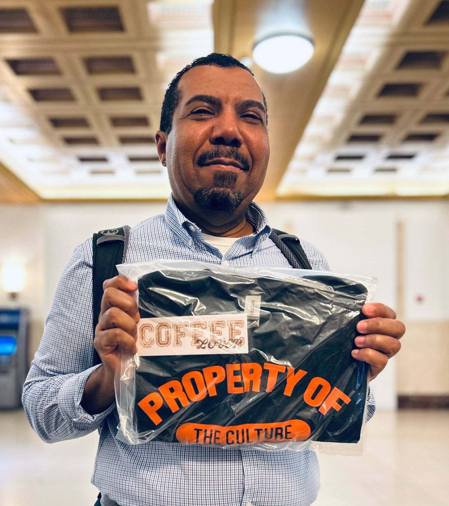 100% COTTON BLACK T-SHIRT WITH ORANGE LETTERS DISPLAYING THE WORDS 'PROPERTY OF THE CULTURE'.