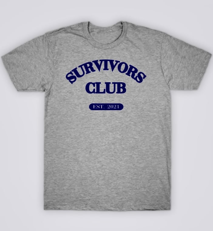 THIS 100% PRE-SHRUNK ASH GREY COTTON T-SHIRT WITH THE WORDS "SURVIVORS CLUB EST 2021" IN NAVY BLUE LETTERS ACROSS THE CHEST, THIS COLLAGE STYLED T-SHIRT IS PERFECT TO SHOW EVERYONE YOU ARE NOW PART OF THE CLUB, SUPER SOFT, MACHINE WASHABLE